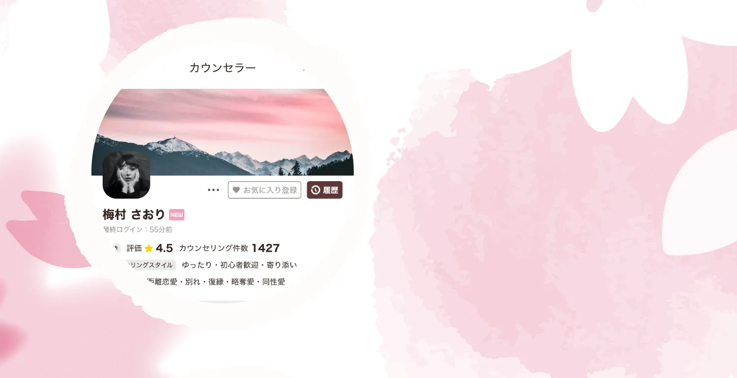 臨床心理士、公認心理師、ナイトワークの方(男性、女性)LGBTQの方、著名人の方、弁護士、司法書士、行政書士、Youtuberなど個性豊かなカウンセラーが多数在籍。その他様々な業種の方も続々と今後入ってくると思われますので乞うご期待ください。
